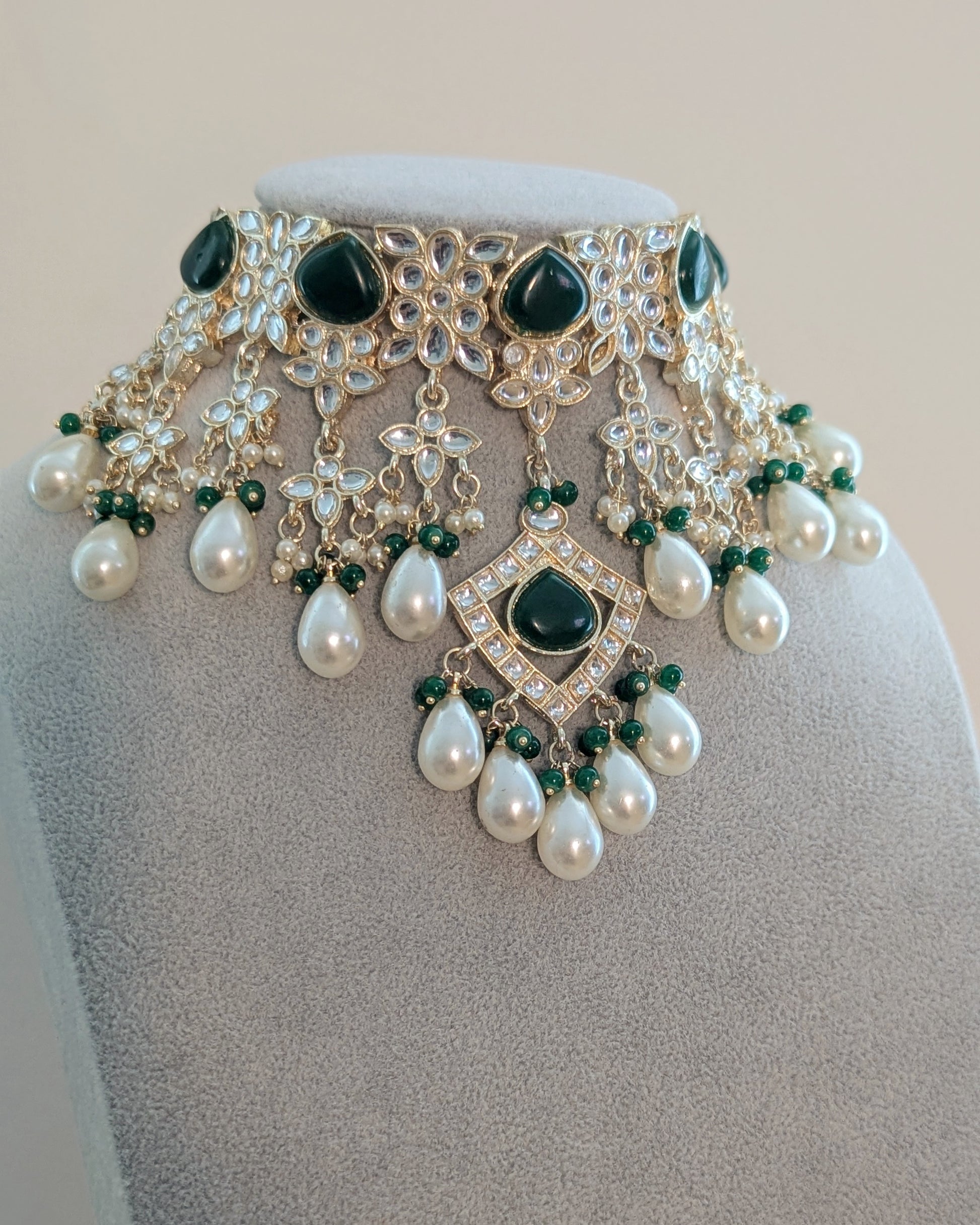 Elevate any ensemble with this luxurious necklace that adds an element of refinement and sophistication. Statement necklace with pearls & green stones, comes with matching earrings and tikka.