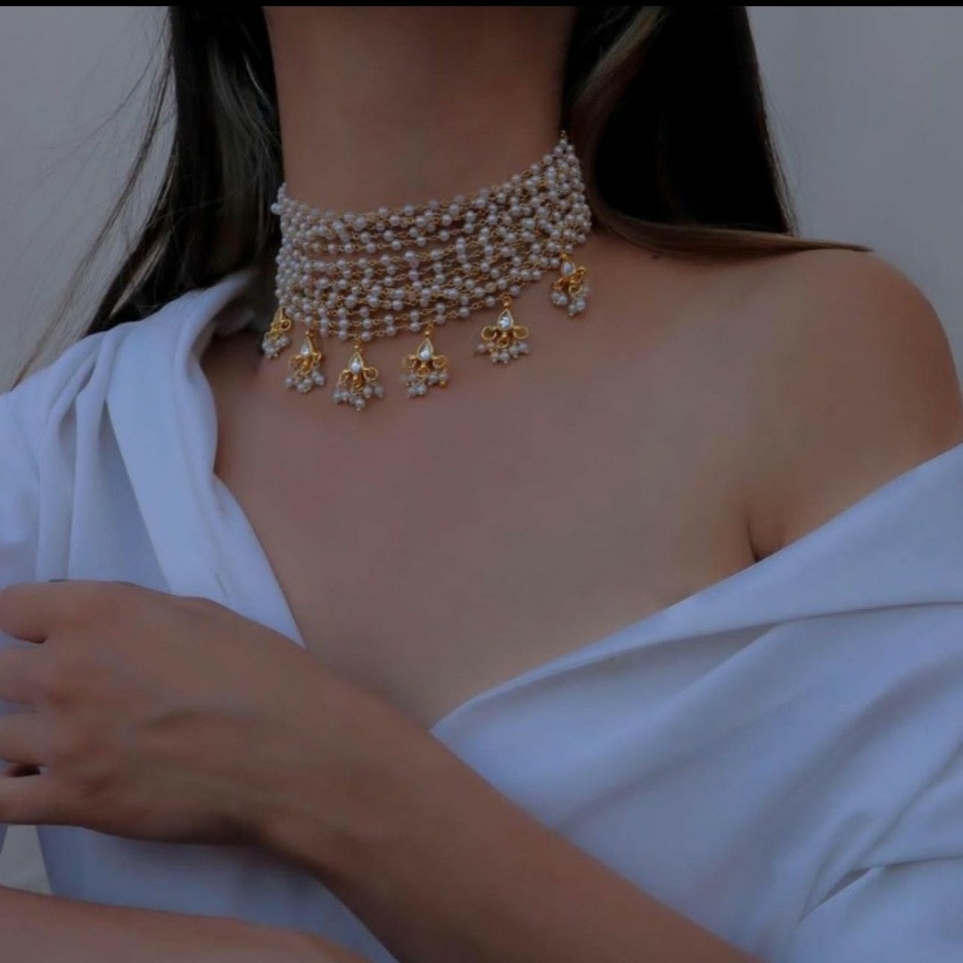 Dainty multi-layer pearl choker, comes with matching earrings.