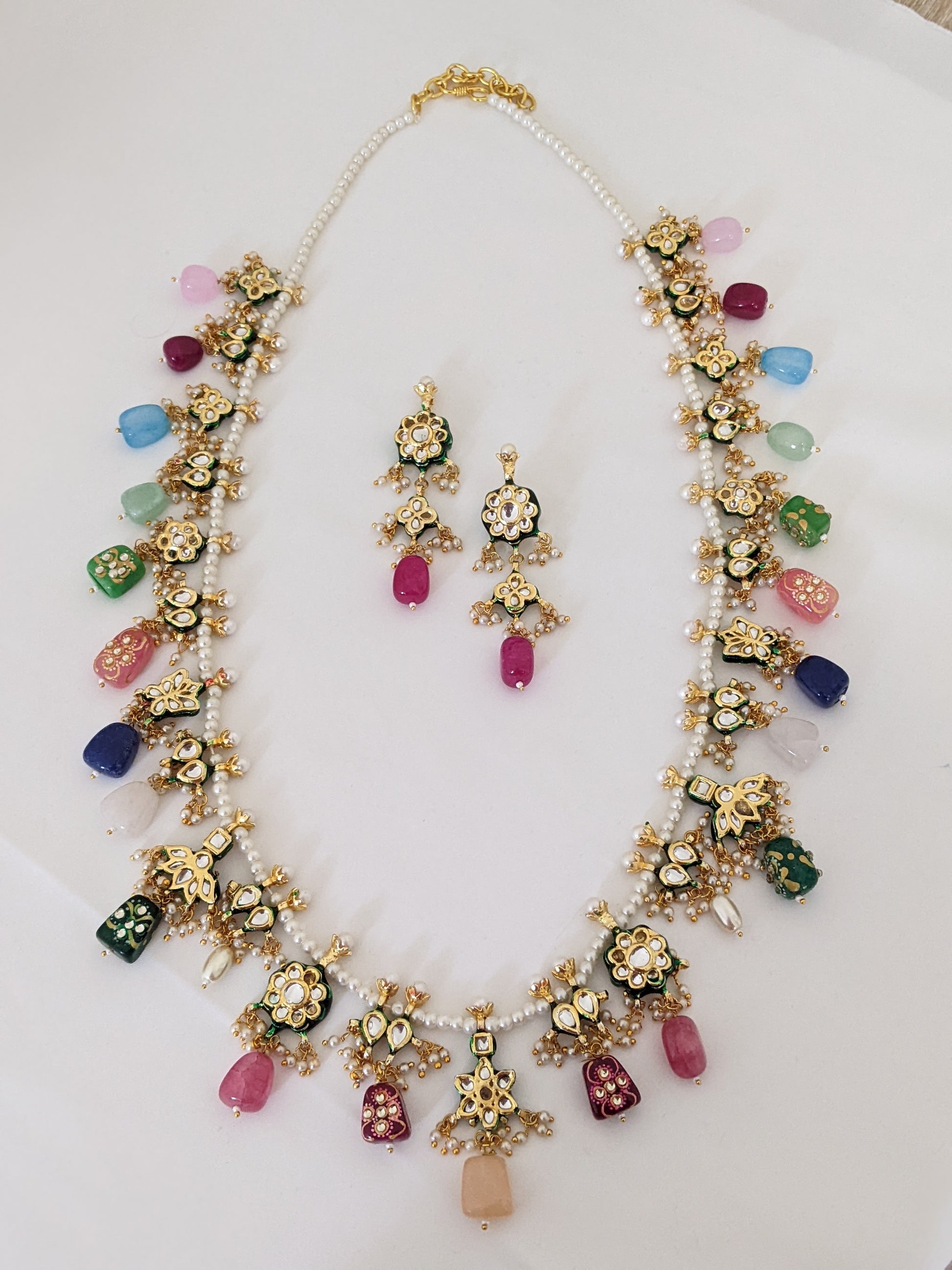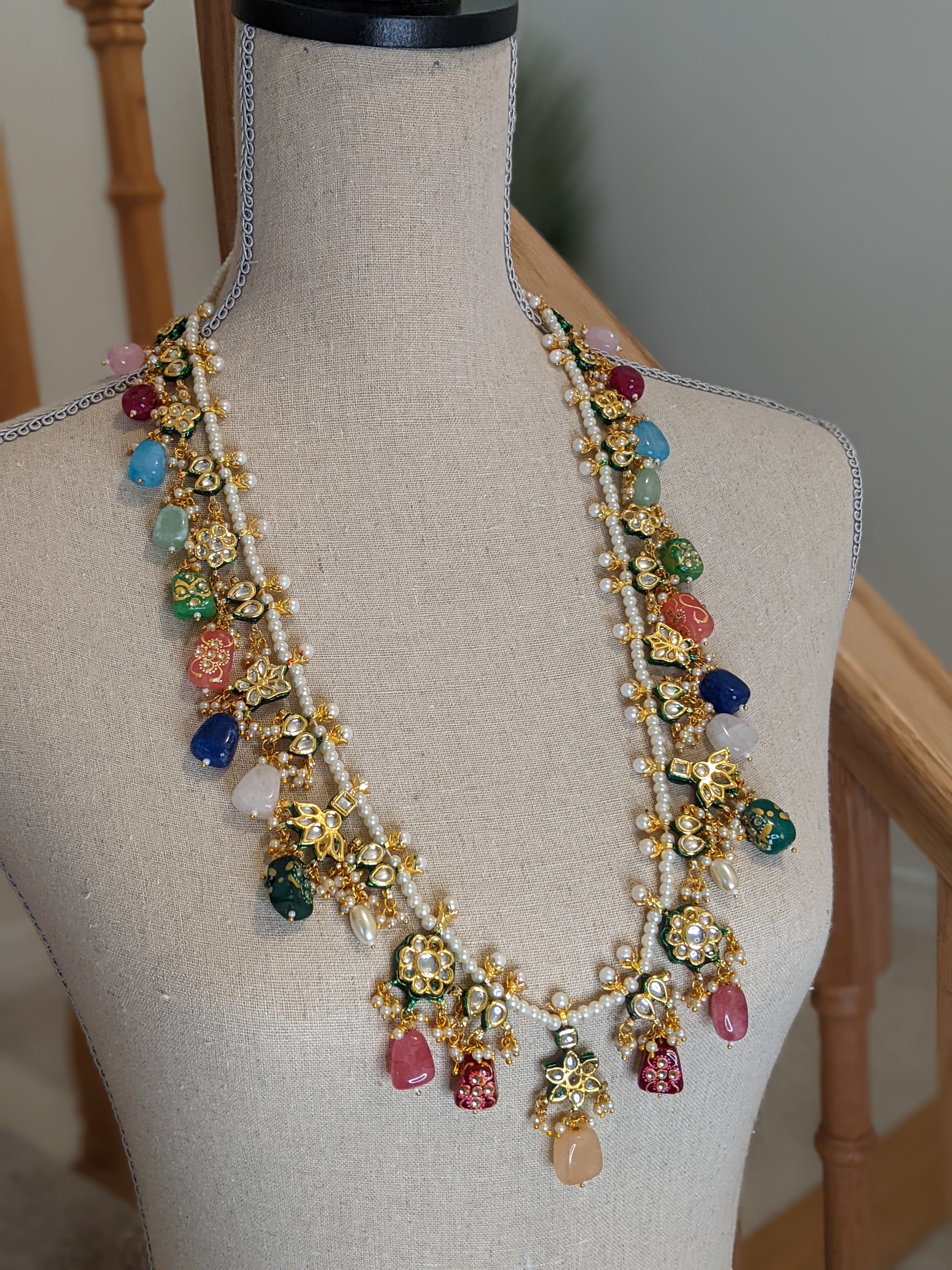 Handcrafted beautiful long Pearl Maala with Kundan details and multicolored stones.