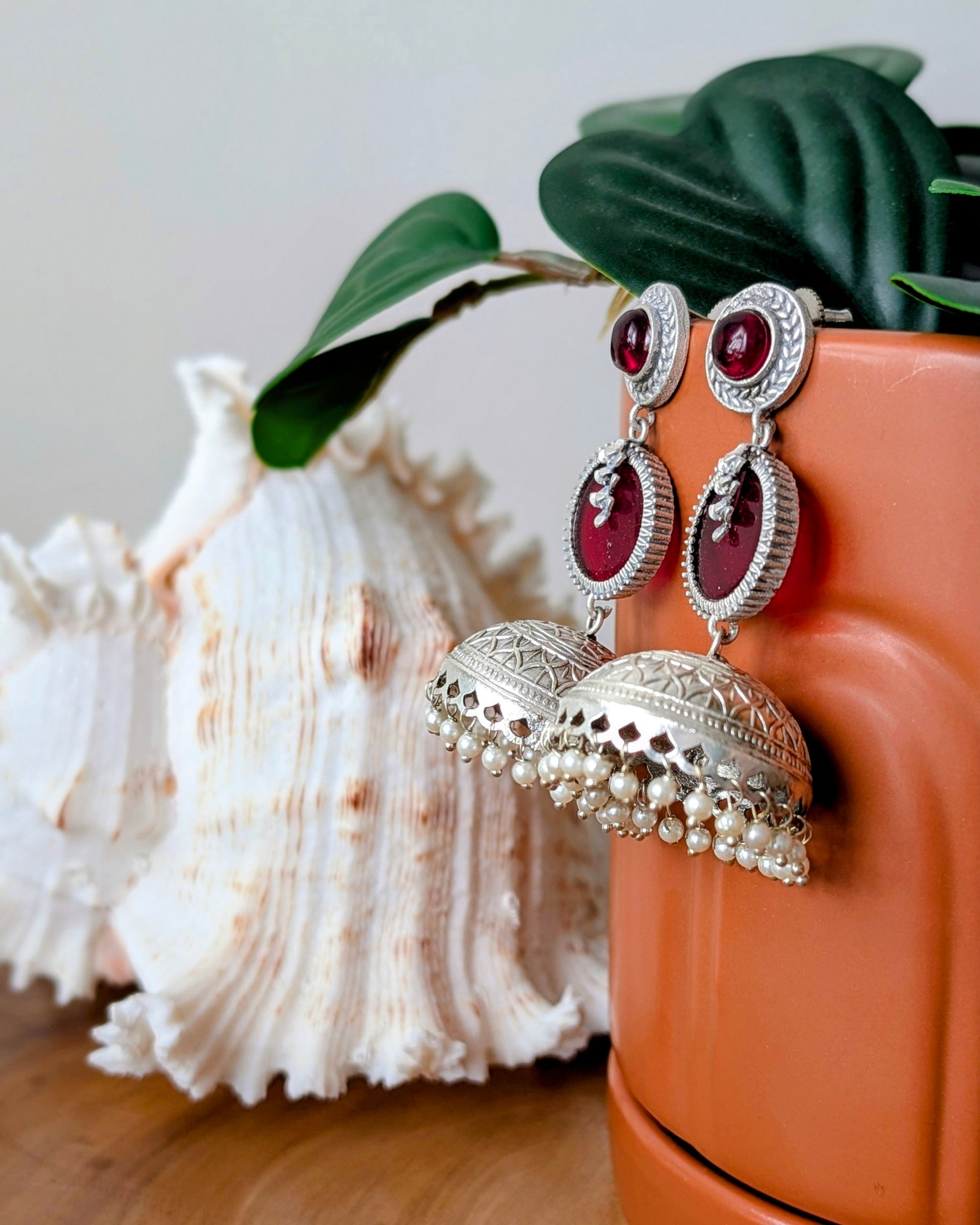 Lightweight oxidized silver jhumki earrings with red stone