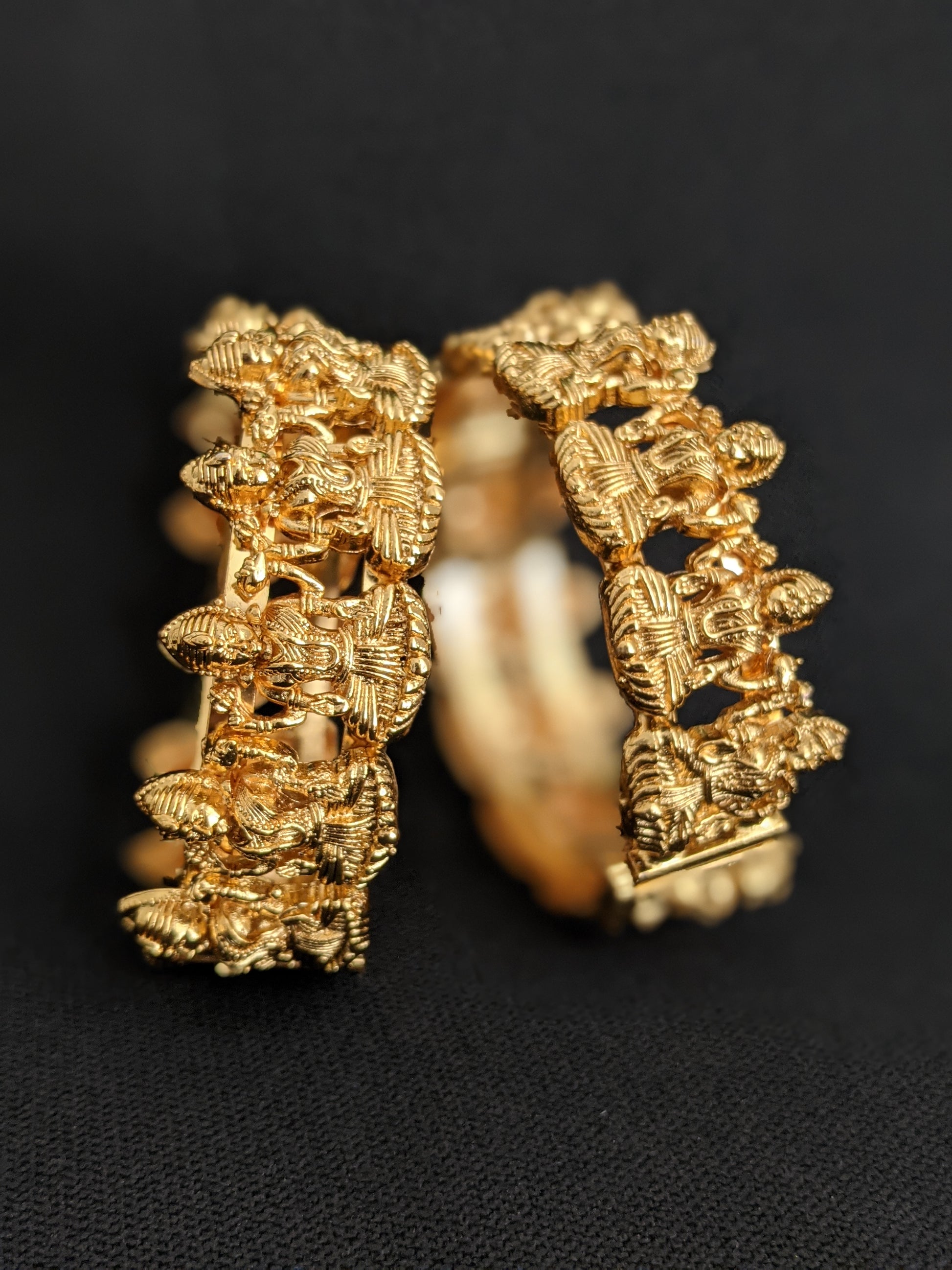 These gold plated Laxmi bangles are intricately designed to perfection. The antique matte finish gives a timeless look. Available in single color & size 2.6 only.