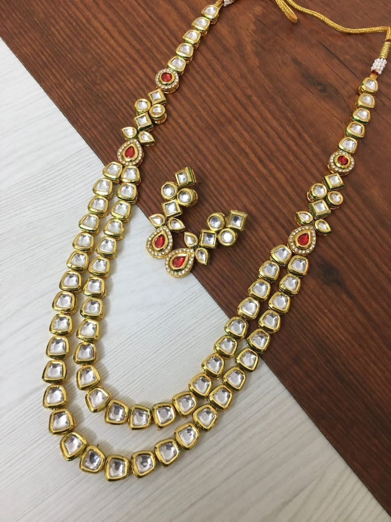 Crafted carefully with two layers of the finest kundan stones and paired with a set of stud earrings, this luxurious necklace is perfect for adding a touch of royalty to any ensemble.