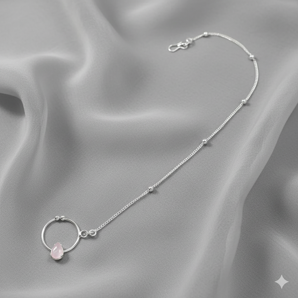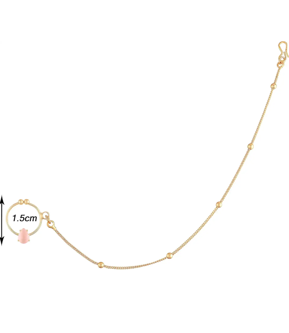 Elegant kundan nath with delicate pearl chain and pink stone, piercing not required.