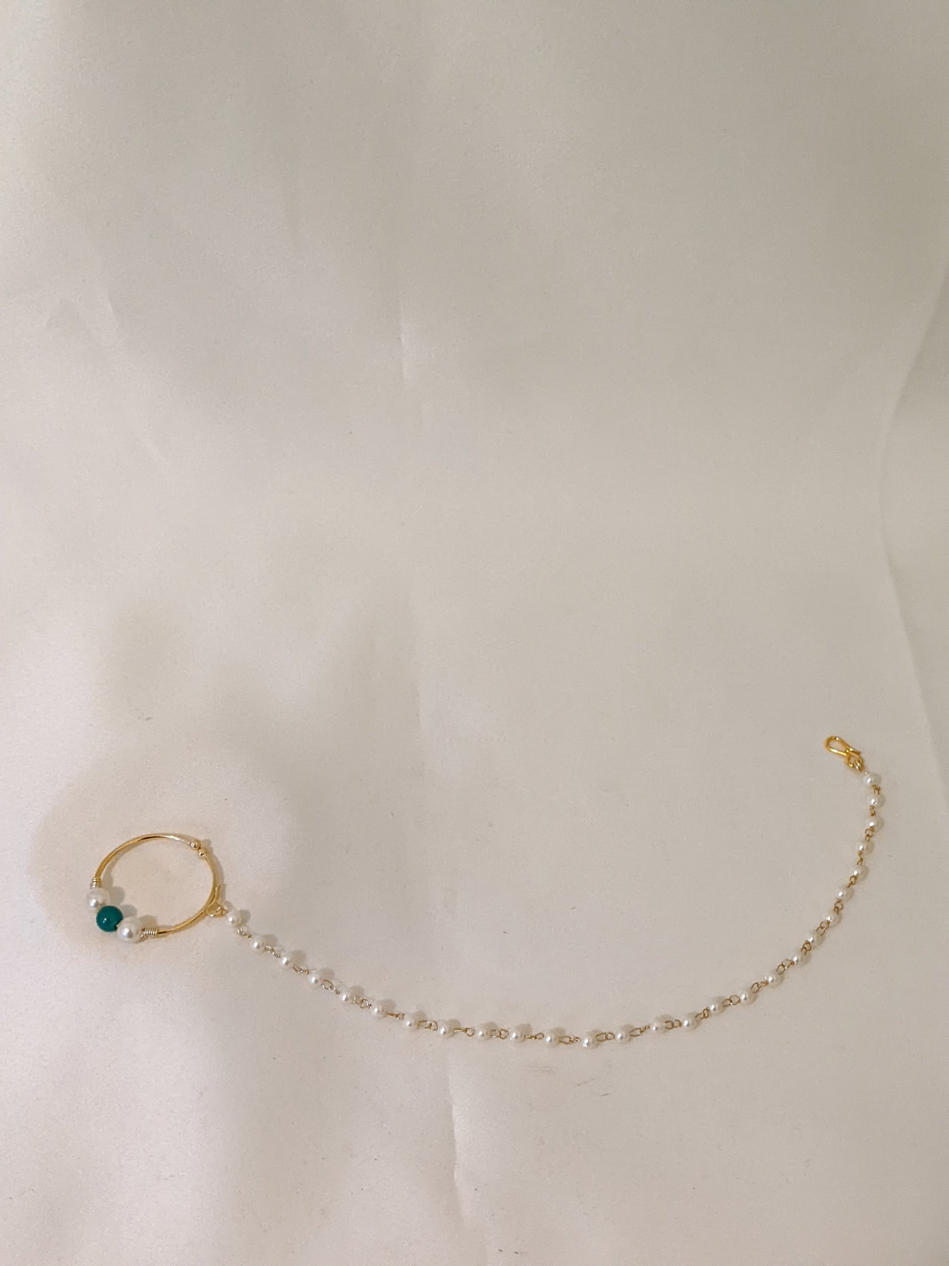 Small sized nose ring with statement green pearl and pearl chain support. Piercing not required!