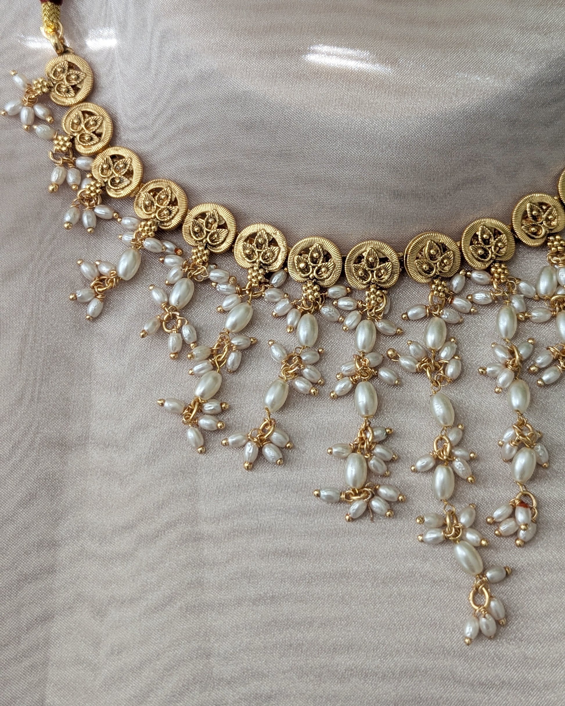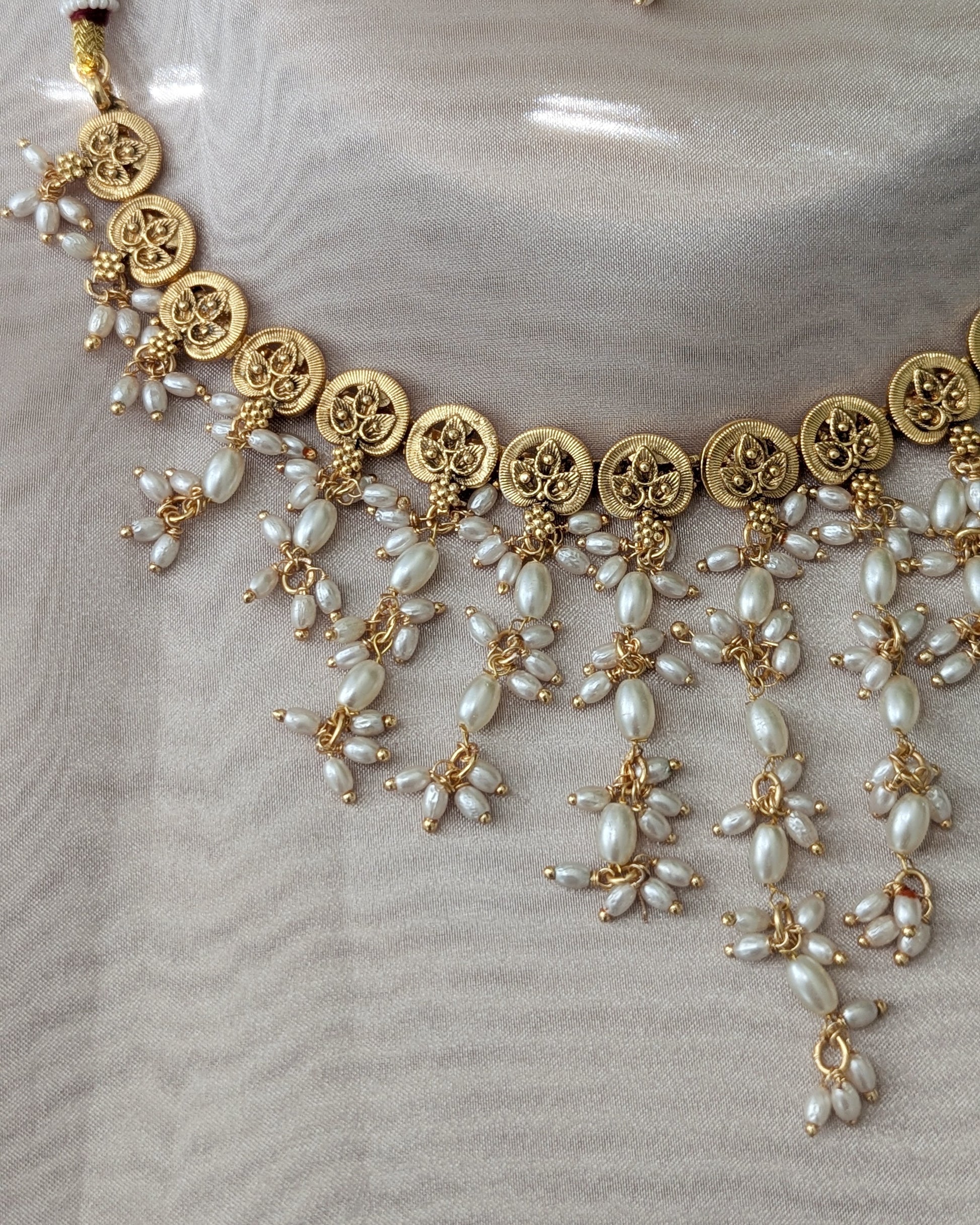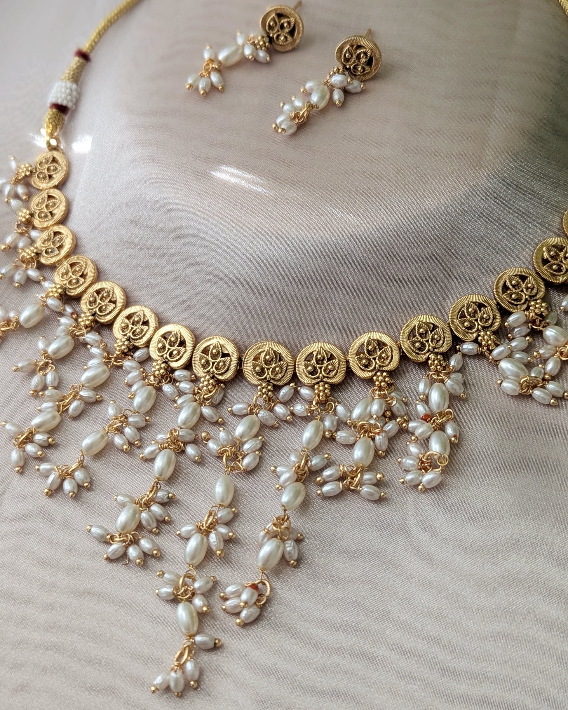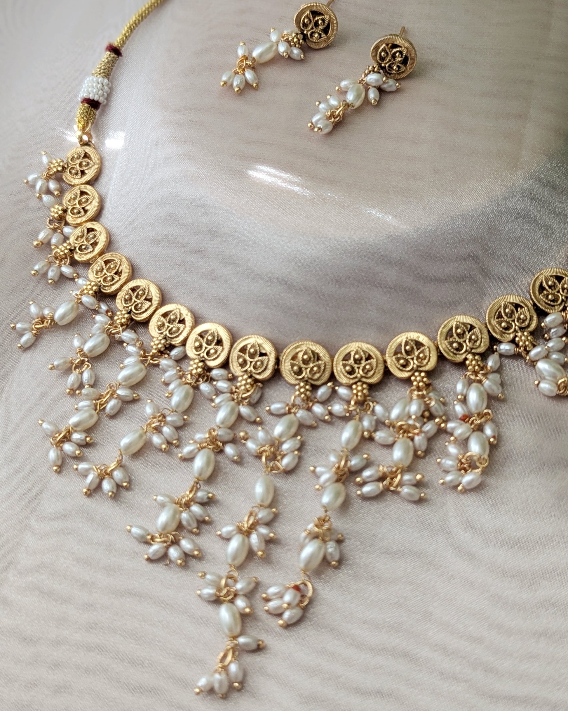Antique golden finish necklace with rice pearls. Comes with dainty earrings.