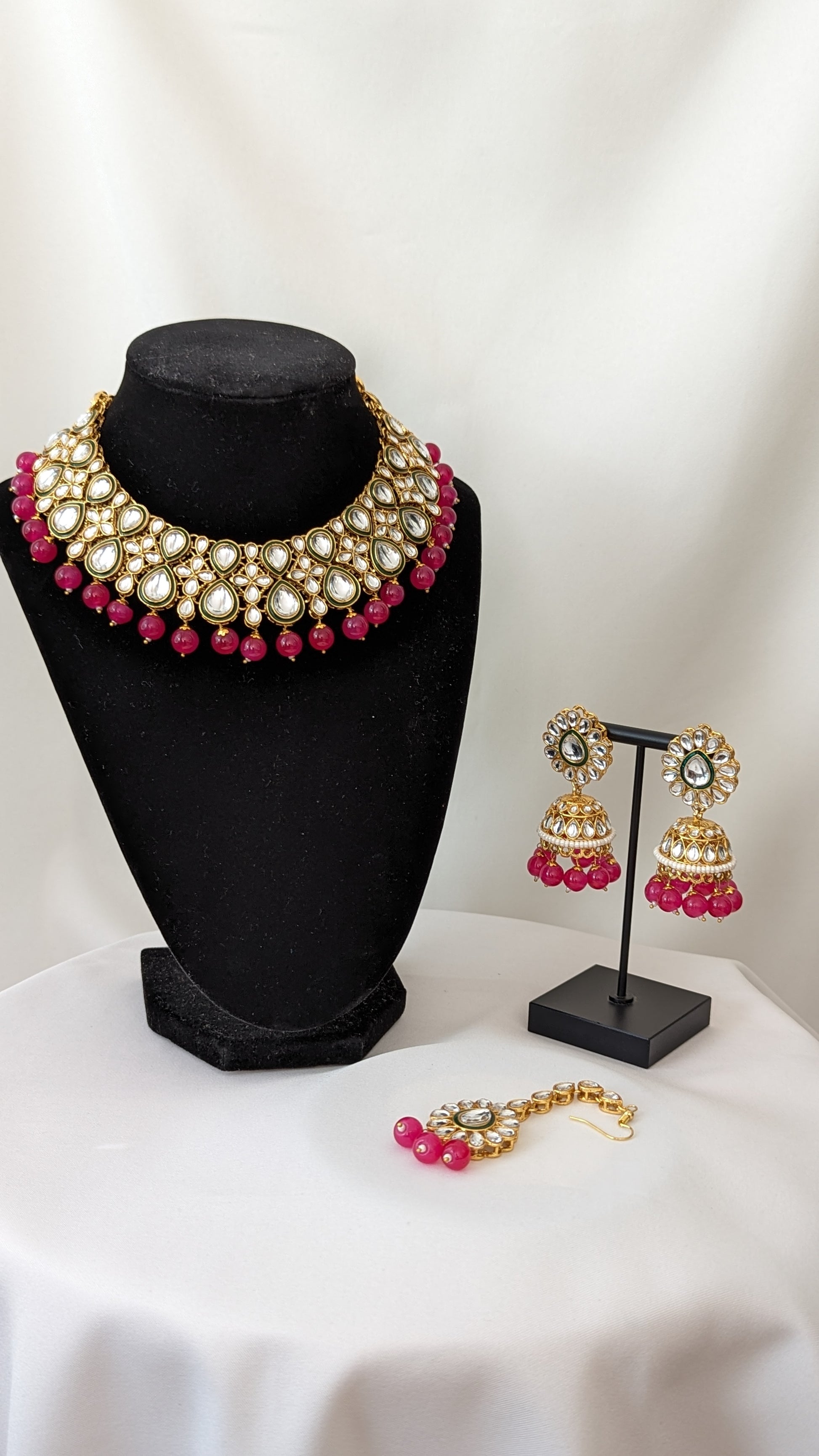 Traditional kundan necklace with dark pink pearls. Comes with matching earrings and tikka.
