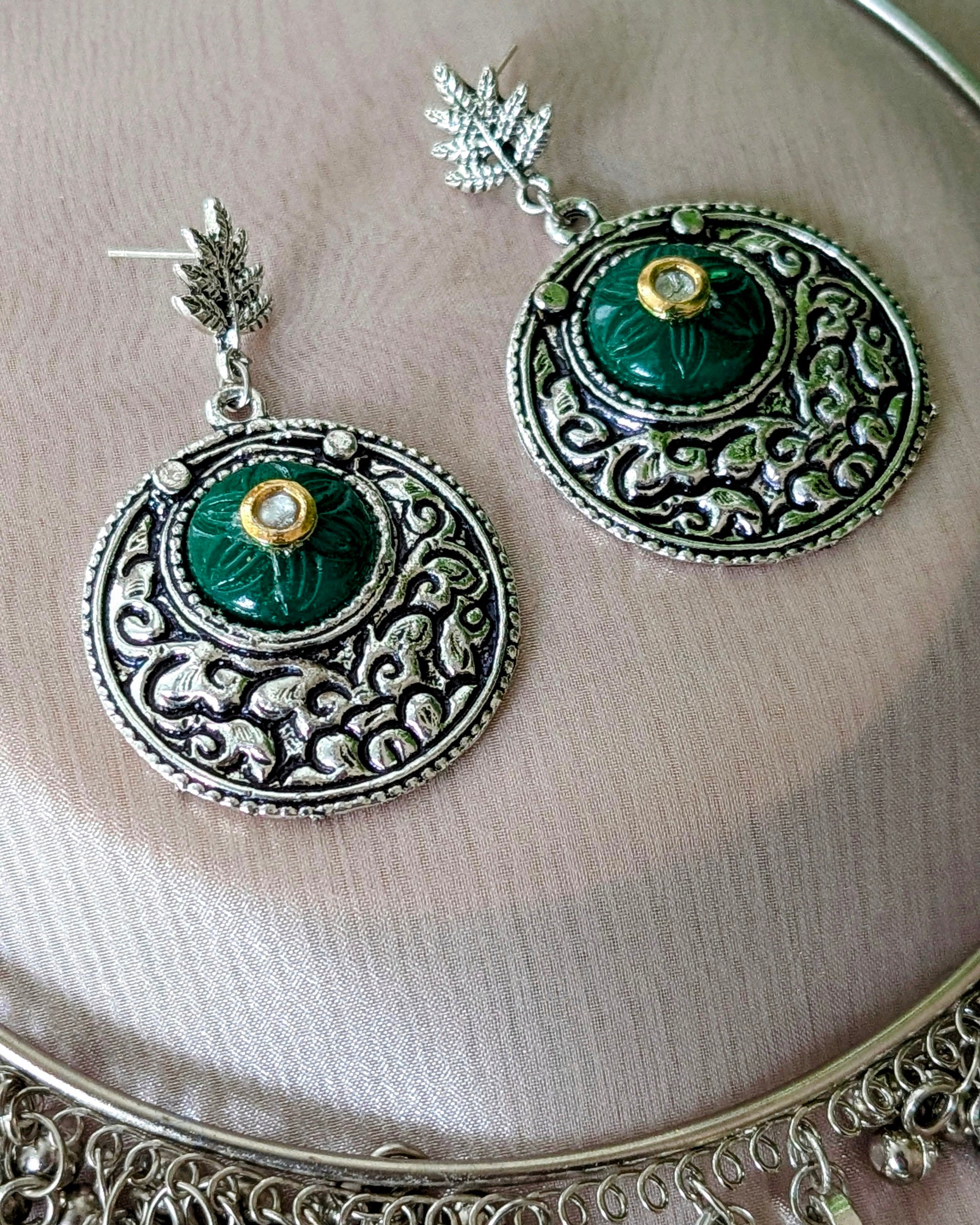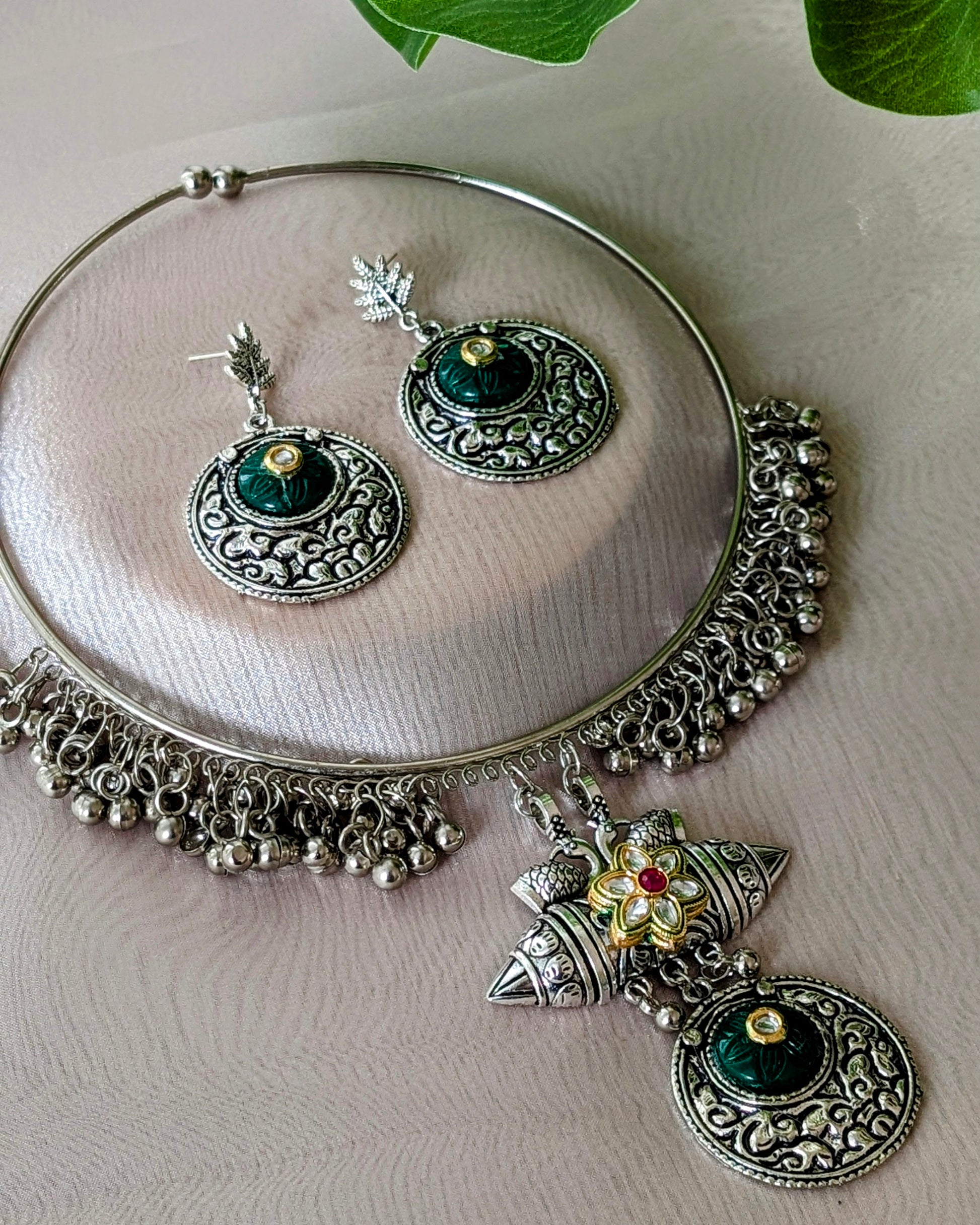 Oxidized silver hasli necklace with statement pendant design with Kundan work, comes with matching earrings.