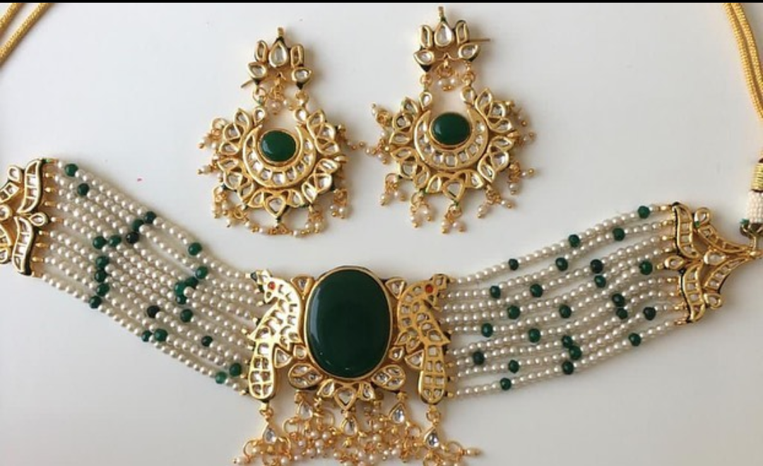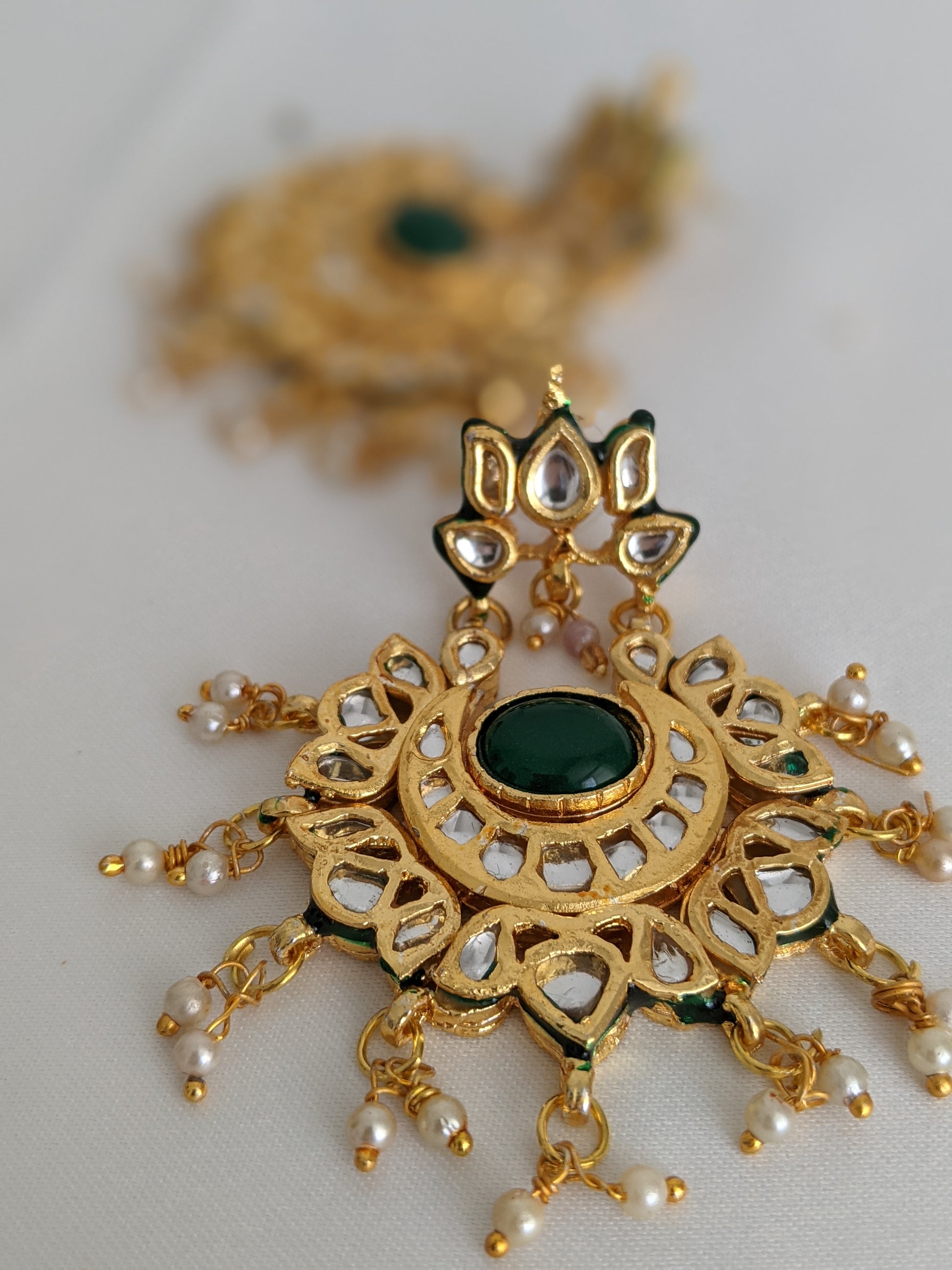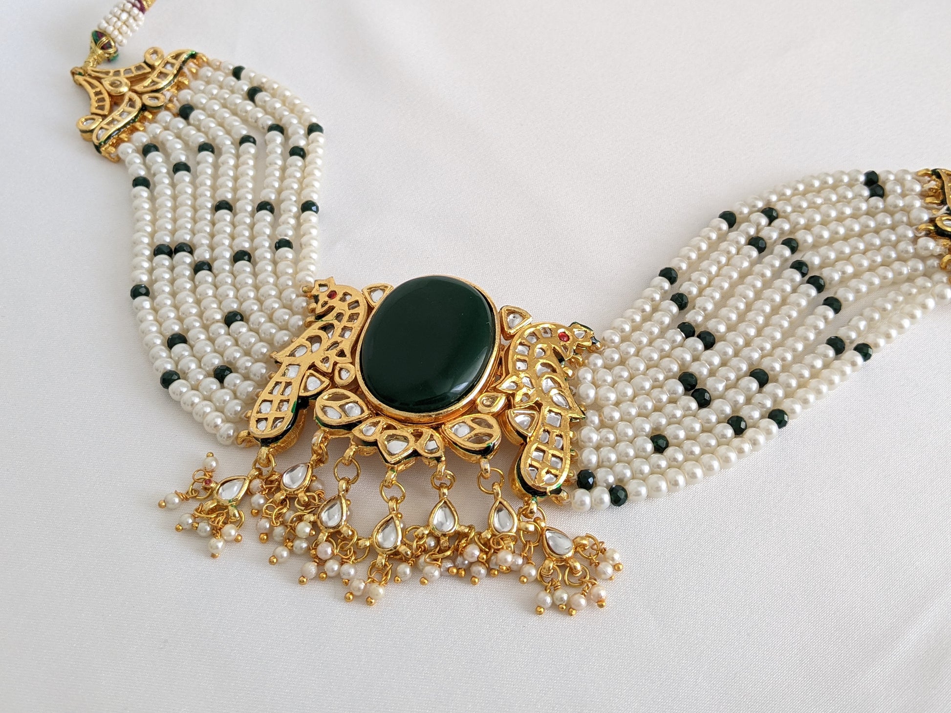 This necklace is epitome of style & elegance. The center emerald green stone is the center of attention of this statement necklace!