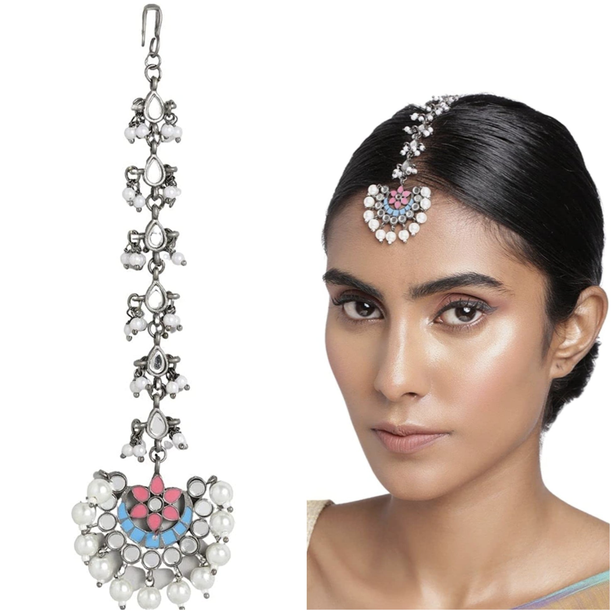 An eye-catching tikka, it features a stunning silver base with multicolored stones that capture the light and sparkle as you move.