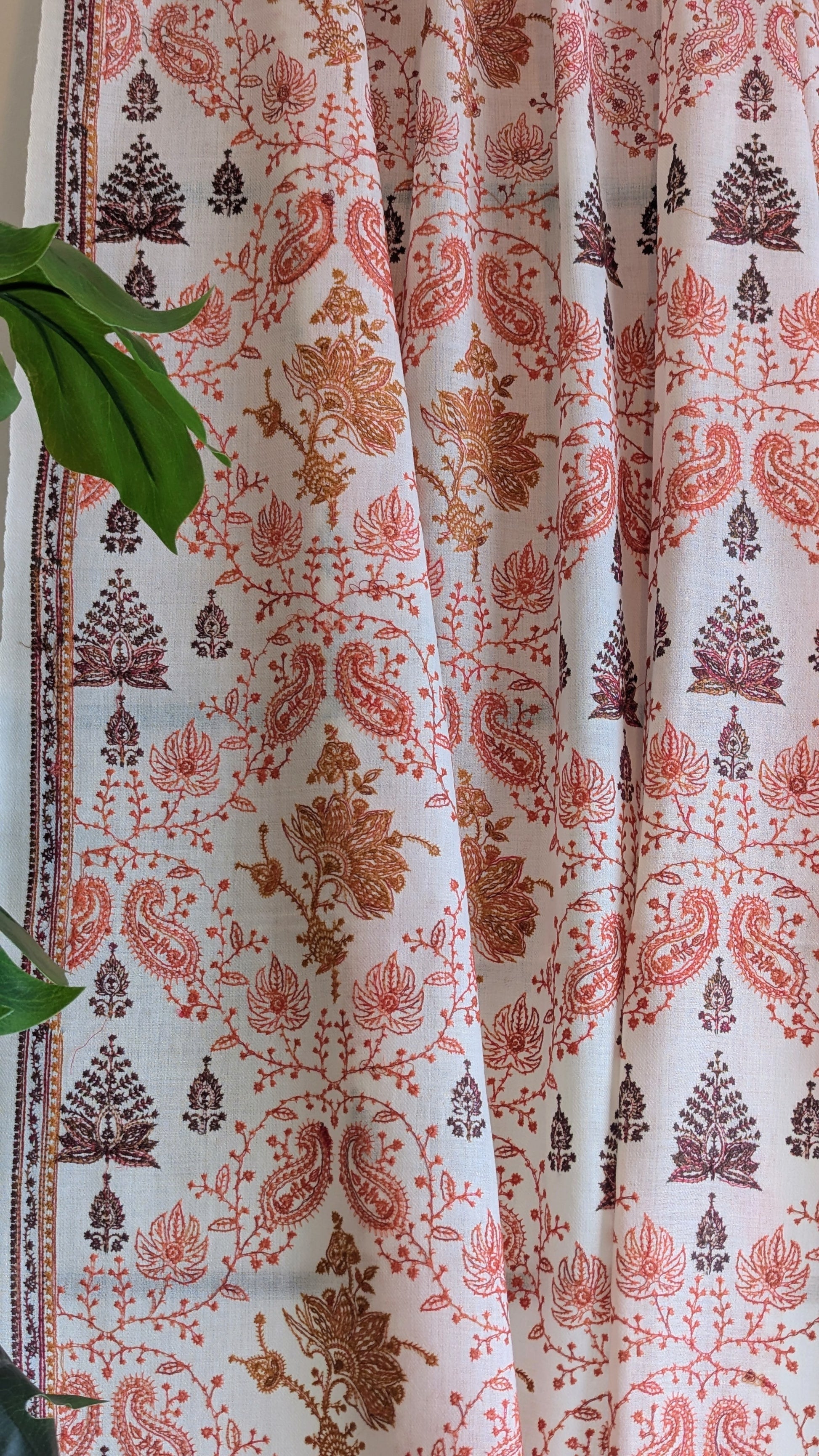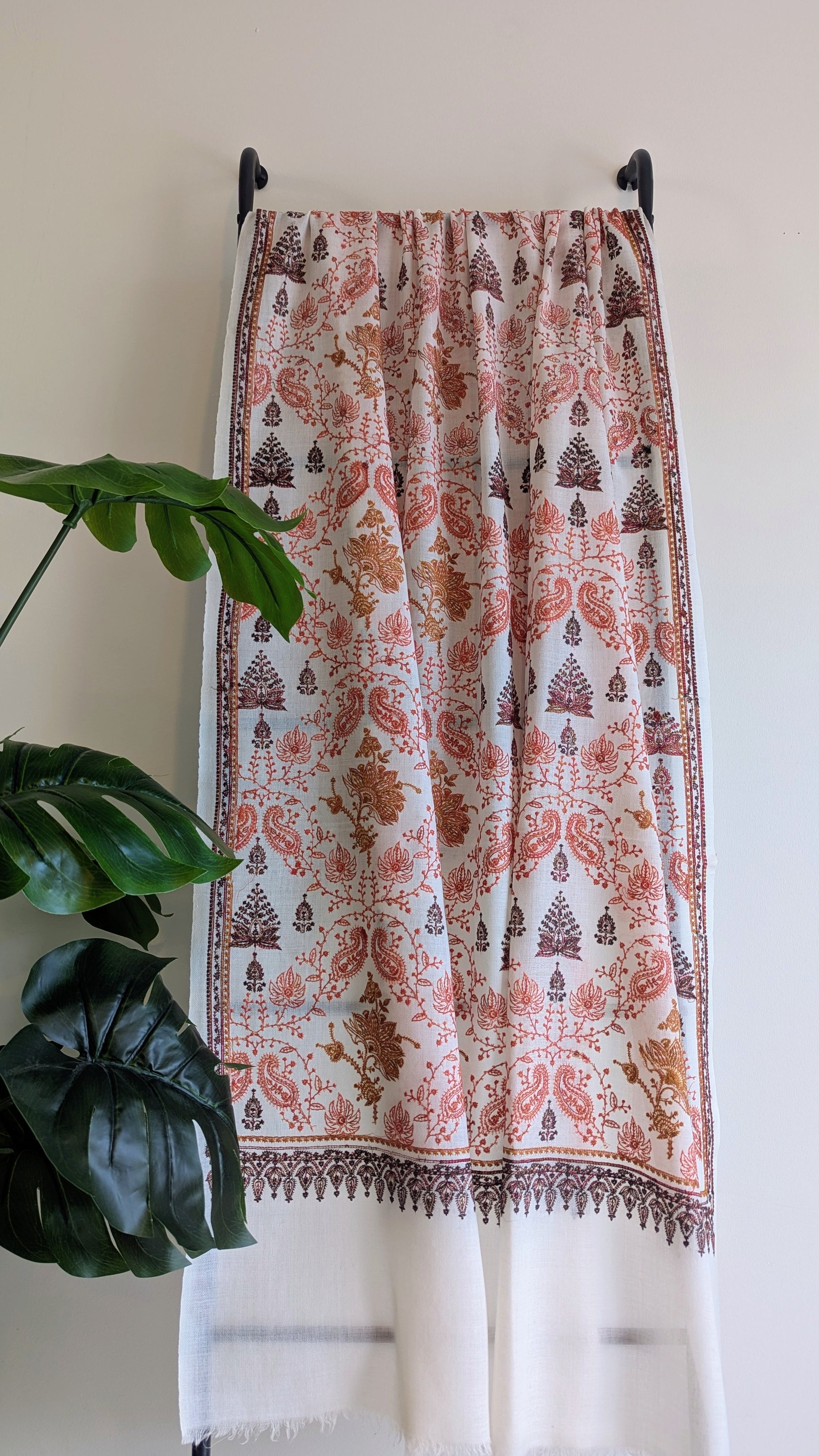 White Pashmina shawl with fine intricate Kashmiri embroidery. A timeless, classic shawl.