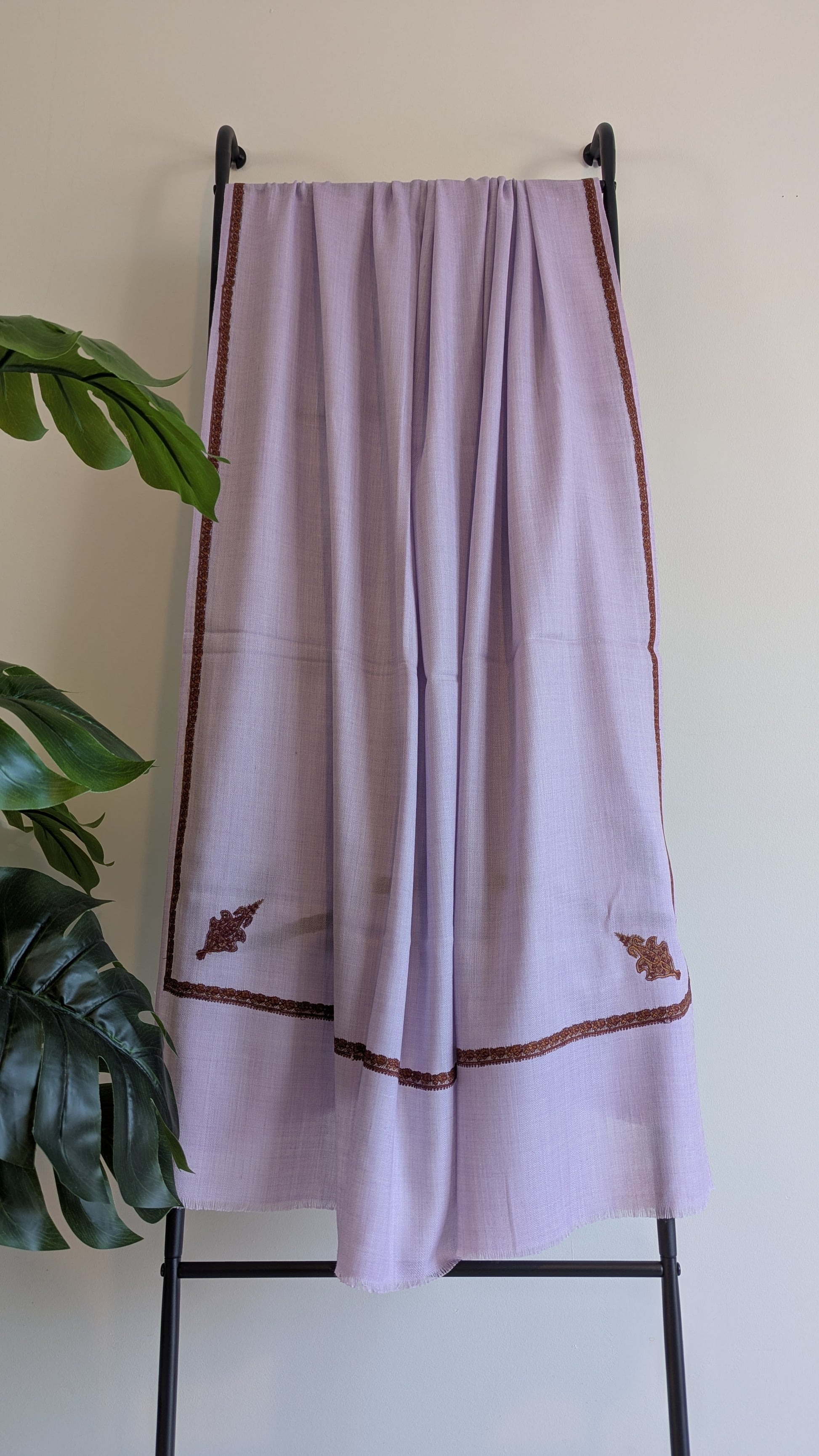 Timeless cashmere wool shawl with embroidery border and motifs.